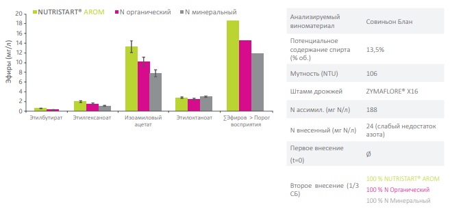 Брожение Совиньон Блан (Сансер) с применением дрожжей ZYMAFLORE® X16. Азотная подкормка: 100% минеральная, 100% органическая или 100% NUTRISTART® AROM. Сусло, прошедшее брожение в присутствиии NUTRISTART® AROM позволяет получить вино с более яркими и многогранными ароматами.